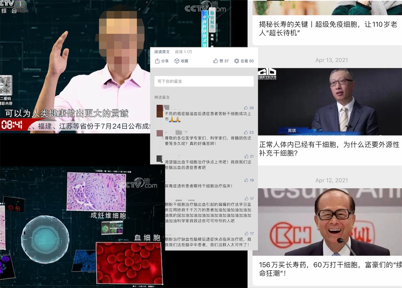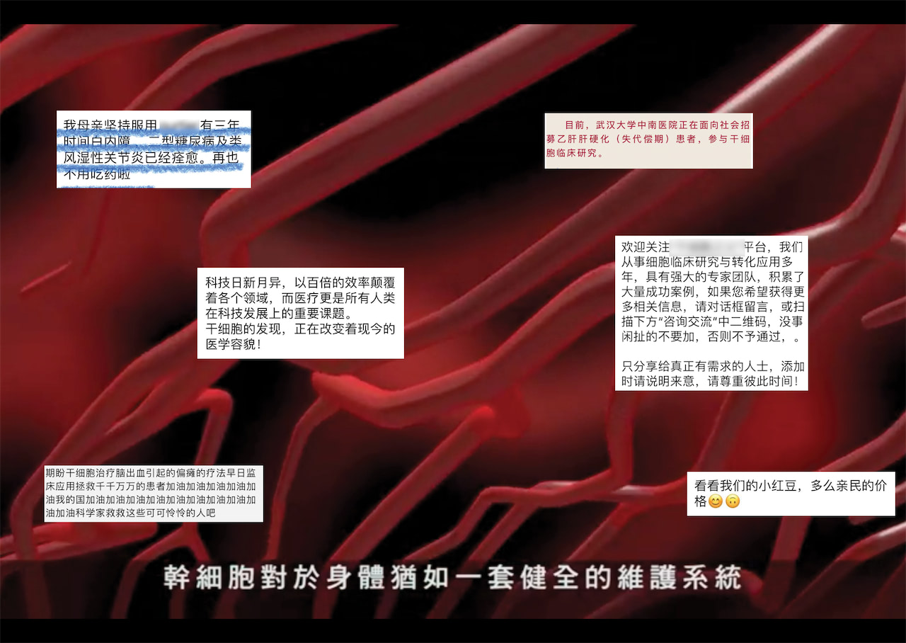 我的视角将从相关社会主张与案例开始。作为一个非生物医学背景的个体,我在介入研究时模棱两可的立场,也将会是我创作的主要线索之一。通过接触前沿生物医学资讯的线上平台,以发现这些组织/机构背后可能涉及的推广、销售药物和治疗疗程的利益链及其受众群体为研究重心,我收集了这些科学“资讯”中的叙事结构和风格,和其中“医药科学”概念延伸出的更复杂的语义与权力,并探究其背后与普通人拥抱医药科技与信息的后现代语境的紧密联系。